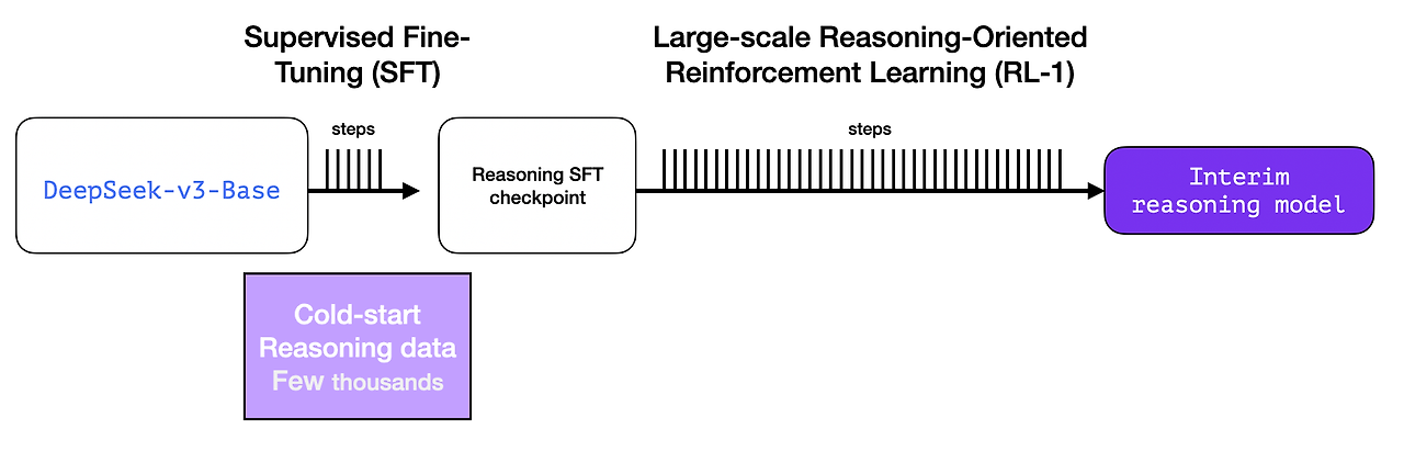 중간 추론 모델을 보다 유용하게 만들기 위해 수천 개의 추론 문제 사례(일부는 R1-Zero에서 생성 및 필터링)에 대한 지도 미세 조정(SFT) 학습 단계를 거칩니다. 이 논문에서는 이를 "콜드 스타트 데이터"라고 합니다.