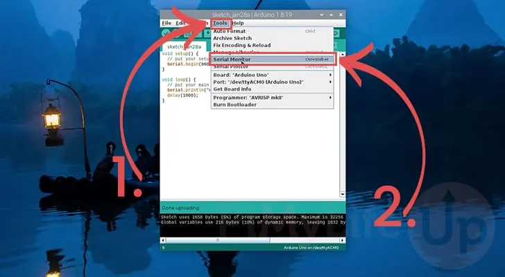 직렬 모니터를 열려면 먼저 상단 메뉴 막대에서 "도구"를 클릭한 다음(1.) "직렬 모니터"라는 옵션을 선택합니다(2.).