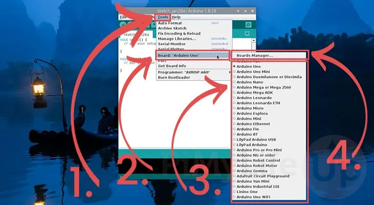 Arduino가 자동으로 선택되지 않았고 목록에서 사용할 수 없는 경우 "보드 관리자..." 옵션(4.)을 클릭합니다.
