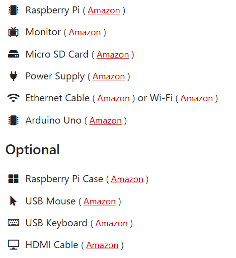 아래는 Raspberry Pi에서 Arduino를 프로그래밍하는 데 사용한 장비 목록입니다.