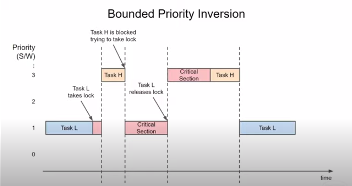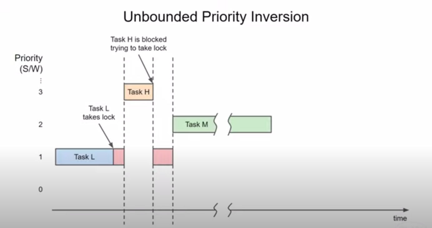 문제 중 하나는 우선순위가 낮은 작업이 성공적으로 잠금을 선점하더라도, 잠금이 반환되기 전에 우선순위가 중간인 작업이 선점될 수 있다는 것입니다. 우선순위가 중간인 작업의 실행 시간이 매우 긴 경우, 우선순위가 중간인 작업이 실행되어 우선순위가 높은 작업이 선점되는 것을 방지할 수 있습니다.