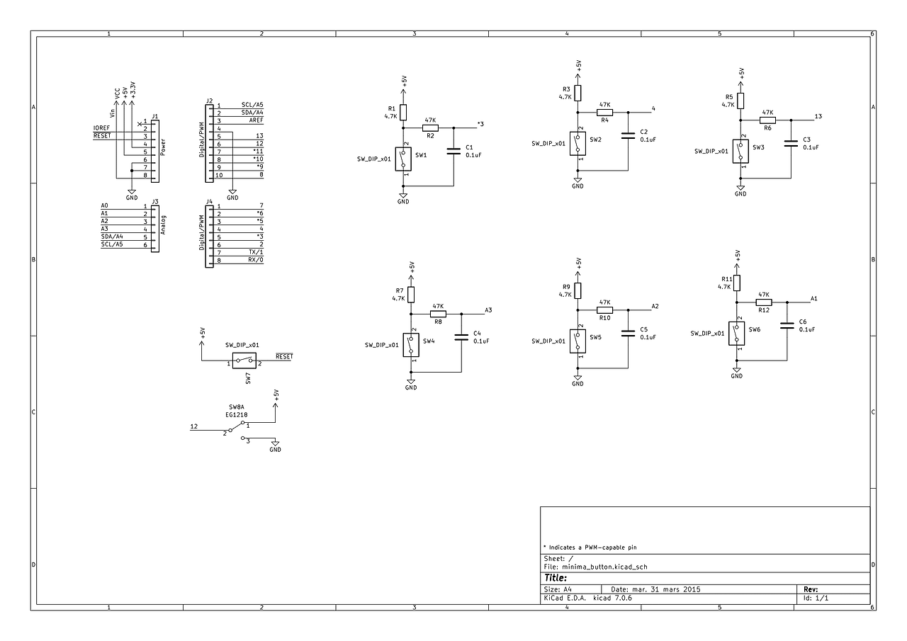 회로도 - 수정이 필요합니다. Reset 버튼은 Low Enable, 13번 핀이 LED에 연결되어 있어 11번 핀으로 연결해야 합니다. - 보드에 사 제가 수정했습니다. 나중에 PCB 제작 시 반영 예정입니다.