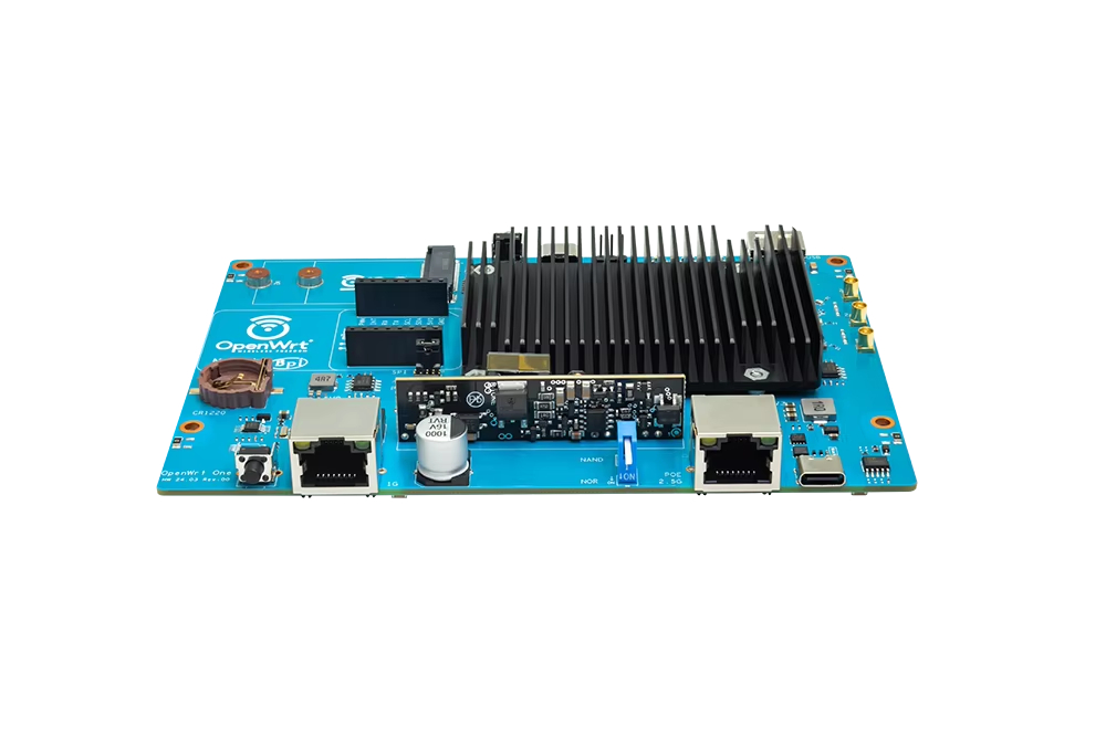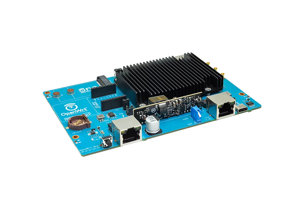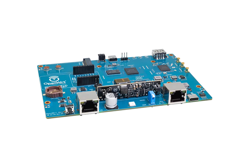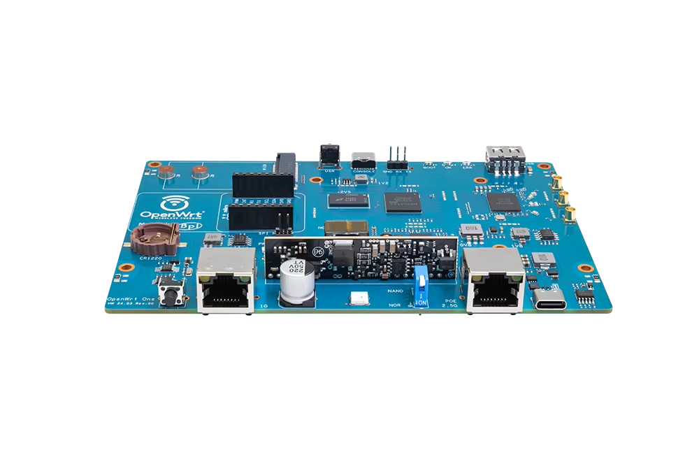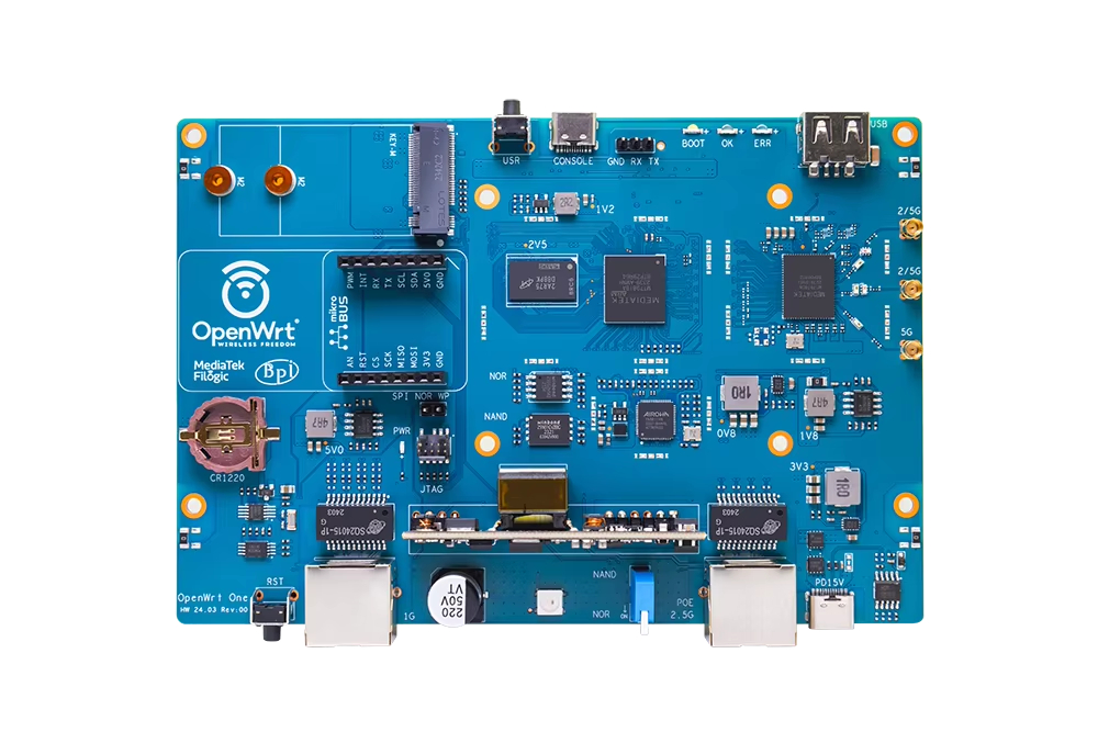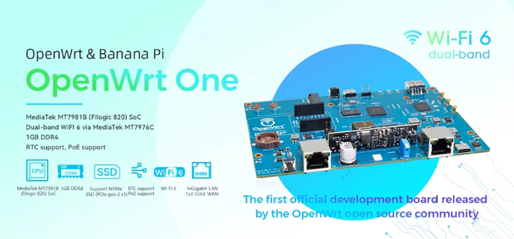 MediaTek MT7981B (Filogic 820) SoC 및 MediaTek MT7976C 듀얼 밴드 WiFi 6 칩셋을 기반으로 한 "OpenWrt One/AP-24.XY" 라우터 보드. OpenWRT 오픈 소스 커뮤니티의 첫 번째 공식 개발 보드입니다.