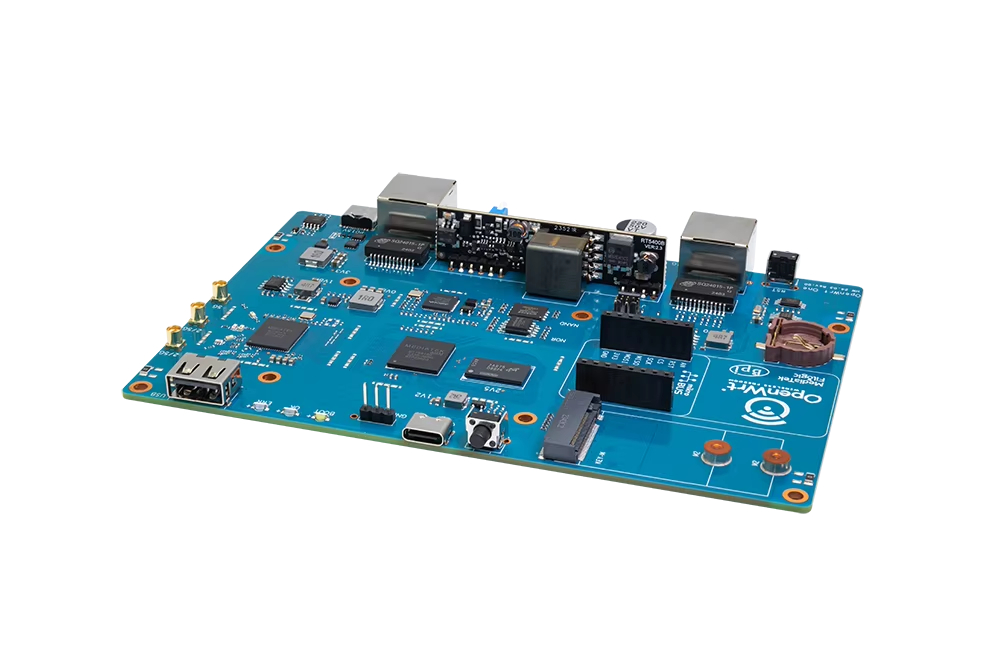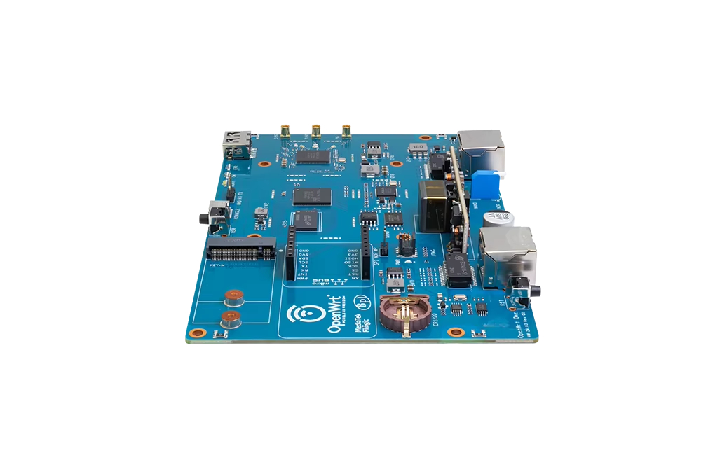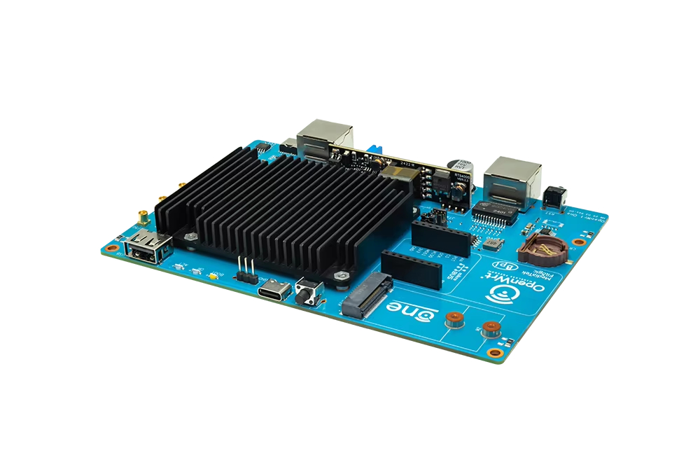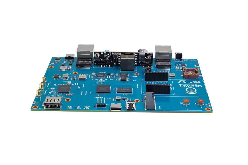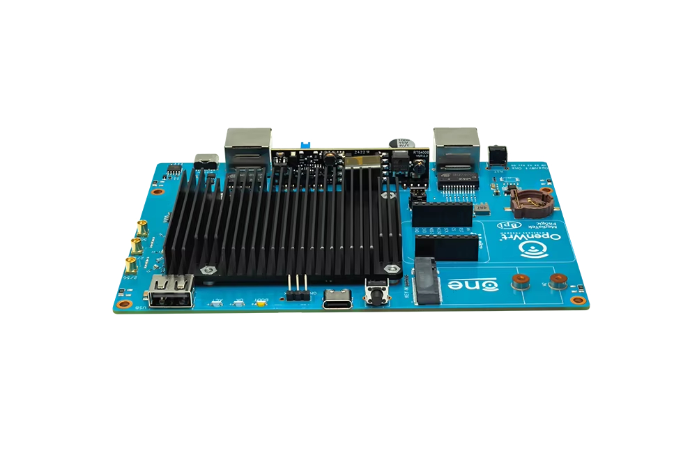 MediaTek MT7981B (Filogic 820) SoC 및 MediaTek MT7976C 듀얼 밴드 WiFi 6 칩셋을 기반으로 한 "OpenWrt One/AP-24.XY" 라우터 보드. OpenWRT 오픈 소스 커뮤니티의 첫 번째 공식 개발 보드입니다.