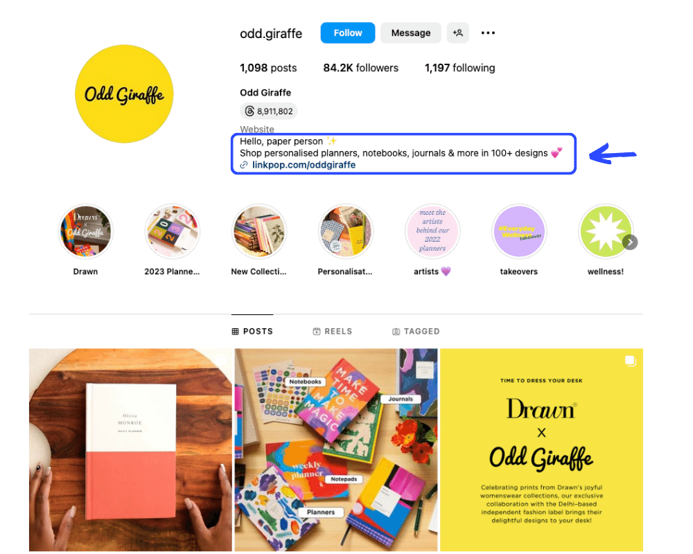 Instagram 바이오는 150자에 불과합니다. 하지만 그것은 잠재적인 팔로워와 고객에게 첫인상을 남기거나 망치는 것입니다. Instagram 바이오의 과학은 바이오를 명확하고 창의적이며 완전하게 만드는 것입니다. 그것을 읽는 사람은 누구나 당신의 회사가 무엇을 하는지, 그것이 어떻게 도움이 될 수 있는지, 그리고 그들이 더 많이 배울 수 있는 곳을 즉시 알 수 있어야 합니다. 개인화된 문구류 브랜드인 Odd Giraffe는 Instagram 바이오로 정확히 요점을 잡았습니다.