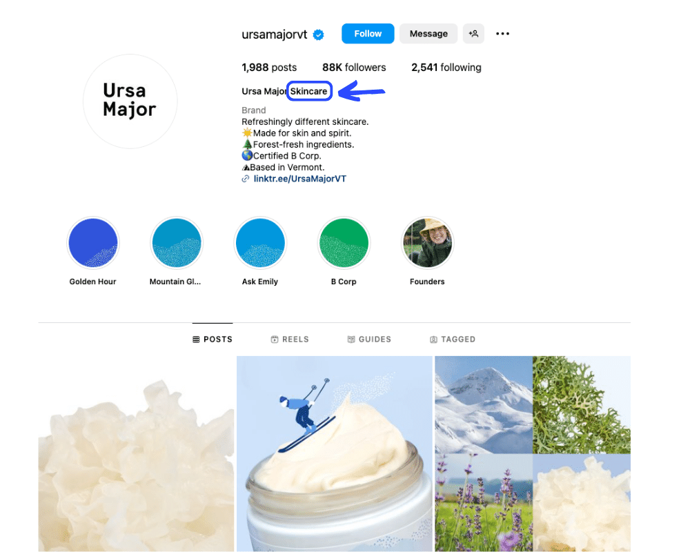 예를 들어 Ursa Major는 Instagram에서 이름에 "스킨케어"를 넣어 누군가가 스킨케어 브랜드와 솔루션을 검색할 때 회사를 더 쉽게 찾을 수 있도록 했습니다.