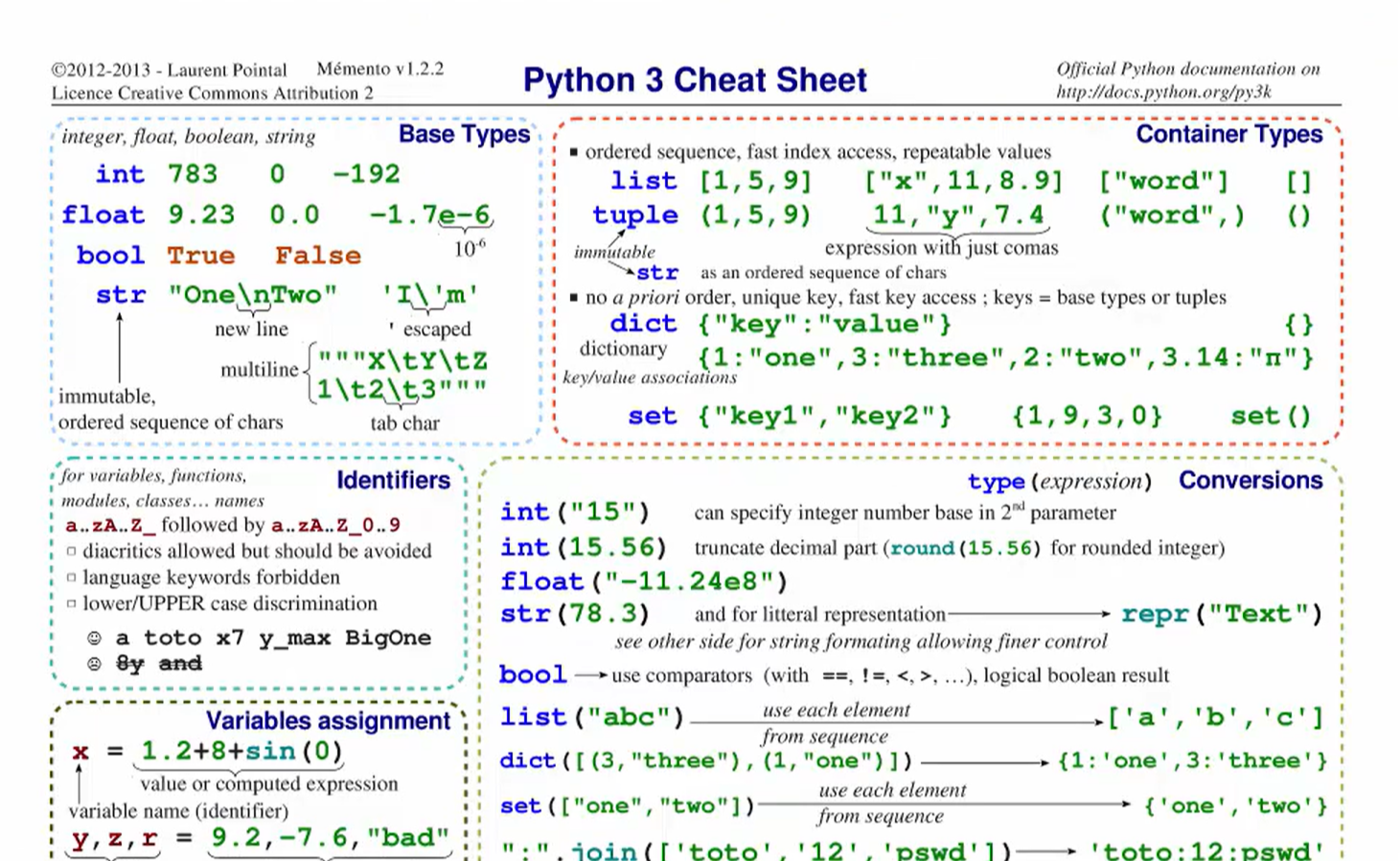- Python 3 Cheat Sheet - Laurent Pointal (PDF)