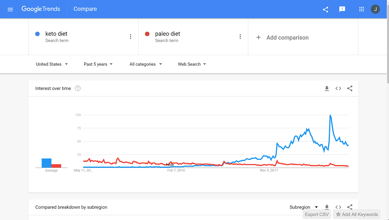 이를 확인하려면 Google 트렌드로 이동하세요. 이 도구를 사용하면 실제로 Paleo와 Keto의 값을 비교할 수 있습니다.