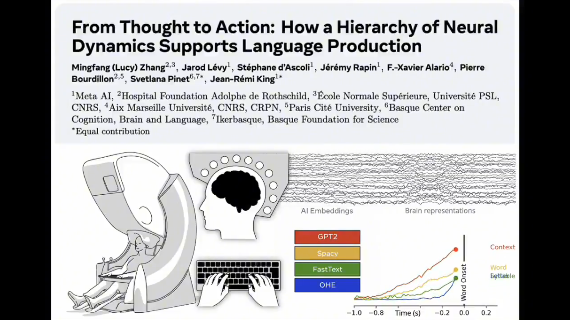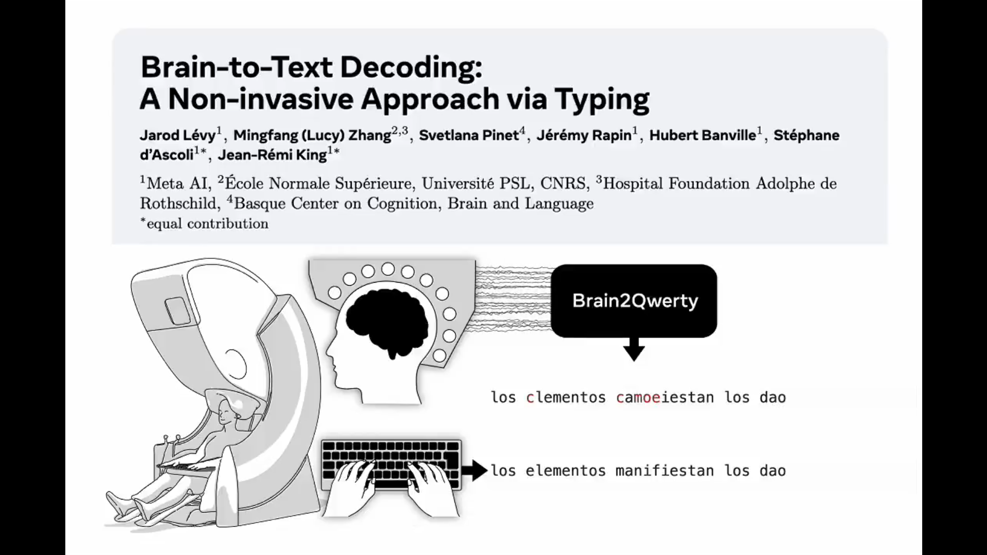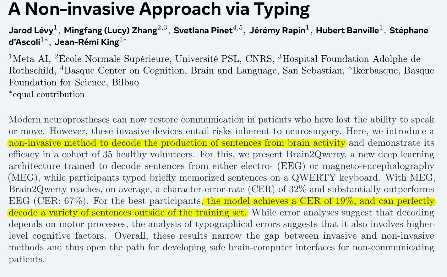여기에서는 뇌 활동에서 문장을 해독하는 비침습적 방법을 소개하고 35명의 건강한 지원자 코호트에서 그 효과를 입증합니다. 이를 위해 참가자들이 간단히 외운 문장을 쿼티 자판에 입력하는 동안 뇌파(EEG) 또는 자기 뇌파(MEG)로부터 문장을 해독하도록 훈련된 새로운 딥러닝 아키텍처인 Brain2Qwerty를 소개합니다.