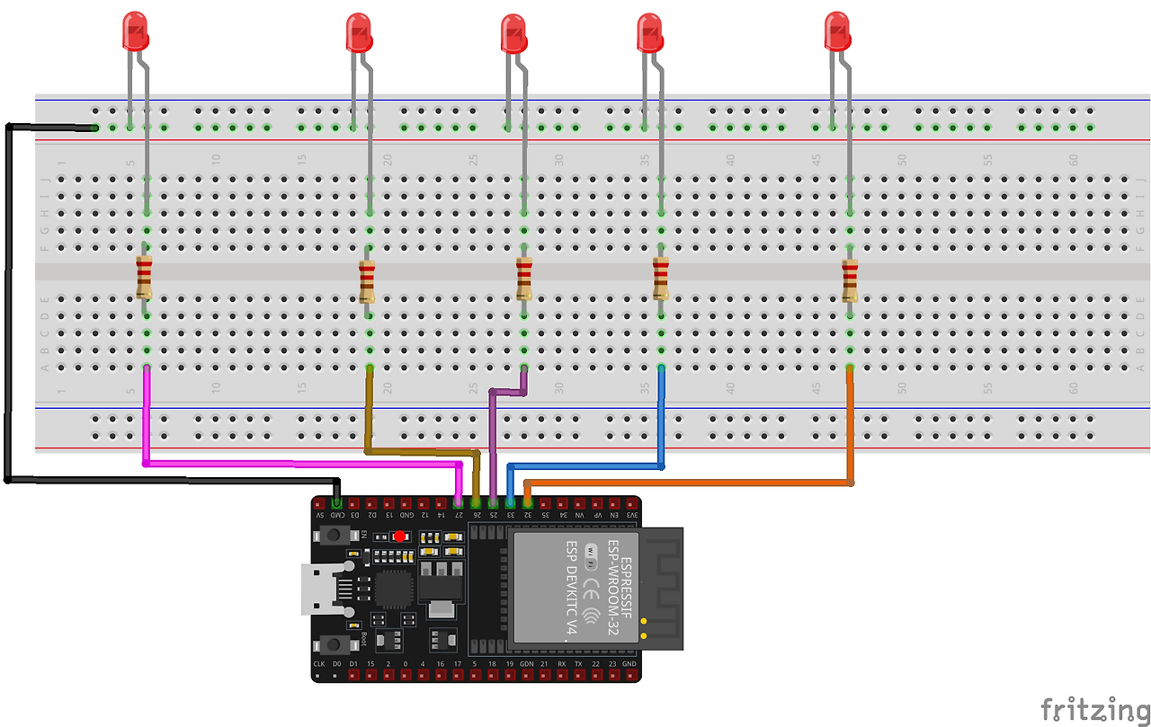 ESP32를 사용하여 5개의 LED를 제어하려면 각 LED가 고유한 손 제스처에 해당하는 ESP32의 특정 GPIO 핀에 연결됩니다. 각 LED의 양극 단자(양극)는 LED를 제어할 GPIO 핀 14, 27, 26, 25, 33과 같은 전용 GPIO 핀에 연결됩니다. 이러한 GPIO 핀은 각 LED를 켜는 데 필요한 전압을 제공합니다. 과도한 전류로 인해 LED 또는 ESP32가 손상되는 것을 방지하기 위해 220Ω 또는 330Ω 저항이 각 LED에 직렬로 연결됩니다. 저항은 LED를 통해 흐르는 전류를 제한하여 안전한 작동을 보장하기 때문에 매우 중요합니다.