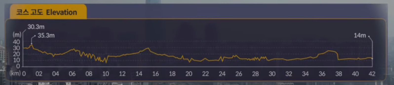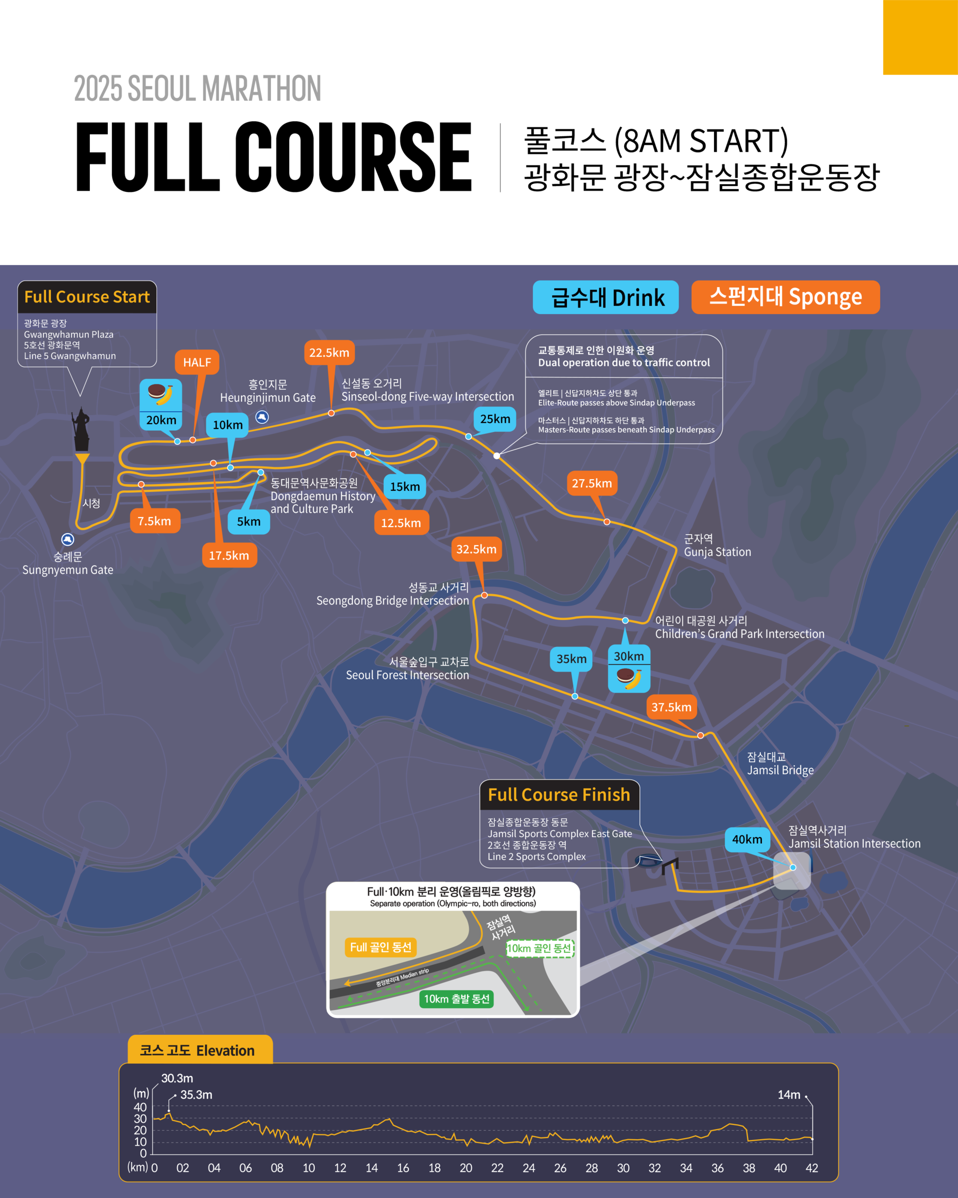 광화문을 출발해 잠실 종합 운동장 동문까지 달리는 주로다. 광화문 넓은 도로에서 출발해 도심 한가운데를 달리는 기분은 마치 무어라도 된듯한 기분이다. 우리나라는 아직 마라톤 응원 문화가 활발하지 않아서 교통을 통제하는 여러 곳에서 옥신각신하지만 일절 신경 쓰지 않는다. 풀코스 지원자가 2만 명이 되니 일단 ㄹ자 코스를 두 번 거치는 청계천을 지나 20km 지점까지는 아무래도 천천히 간다.