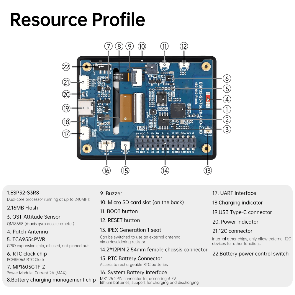 온보드 스피커, QMI8658 6 축 센서, RTC 클럭 센서, Micro SD 카드 홀더, 배터리 충전 관리 모듈 등
