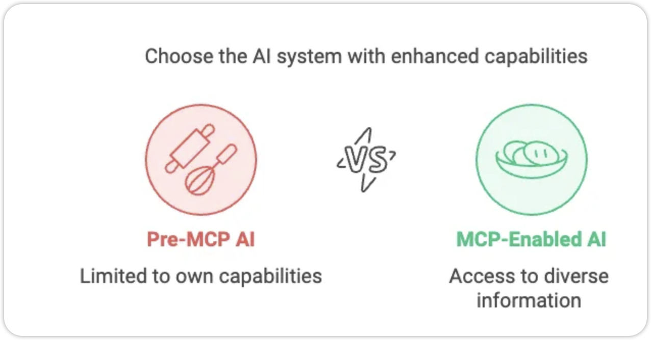 MCP 이전에는 AI 모델에 외부 도구마다 사용자 지정 통합이 필요했습니다. MCP의 표준화된 인터페이스는 플러그 앤 플레이 방식을 가능하게 합니다.