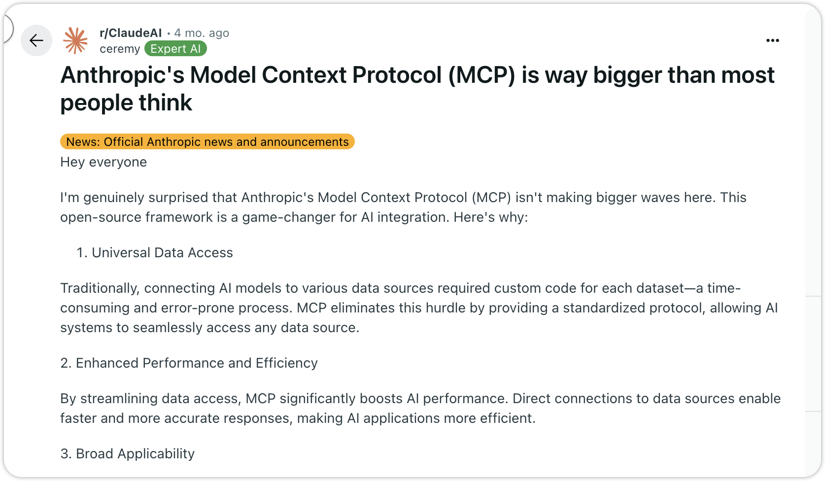 MCP는 AI 통합을 위한 사실상의 표준이 되어가고 있으며, AI 에이전트, 엔터프라이즈 자동화, 연구 애플리케이션에서 채택이 빠르게 증가하고 있습니다. 이 Reddit 토론에서 MCP의 영향에 대해 자세히 알아보세요.
