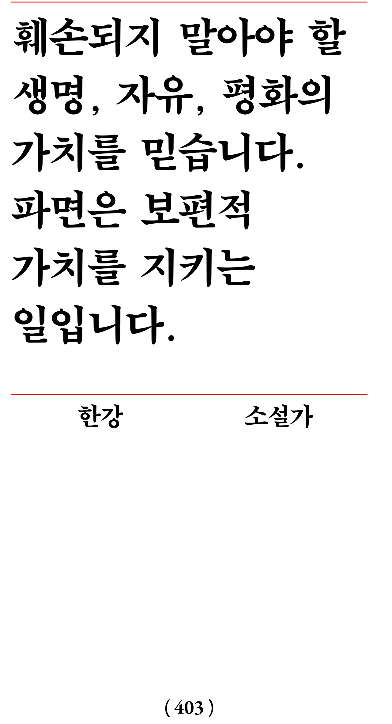 * 훼손되지 말아야 할 생명, 자유, 평화의 가치를 믿습니다. 파면은 보편적 가치를 지키는 일입니다. 한강 소설가
