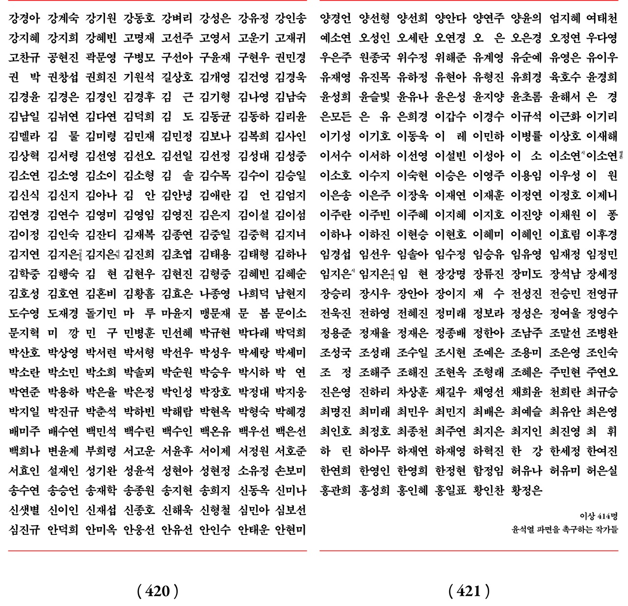 아래 414명의 작가는 각자의 목소리로 성명을 발표합니다. 우리의 목소리가 헌법재판소에 닿길 바랍니다.