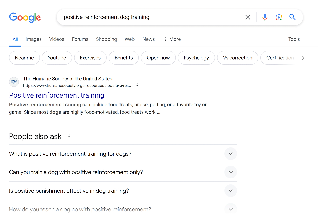 예를 들어, 이 주제에 대한 콘텐츠를 작성하는 경우 "개 행동 훈련"을 기본 키워드로 선택할 수 있습니다.