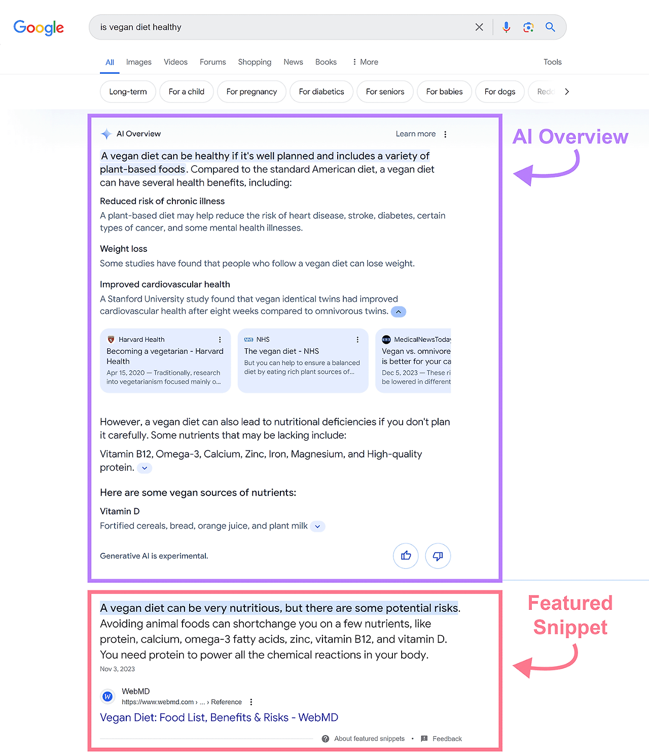 예를 들어 "채식주의 식단이 건강한가"를 검색하면 다음과 같이 AI 개요와 추천 스니펫이 표시될 수 있습니다.