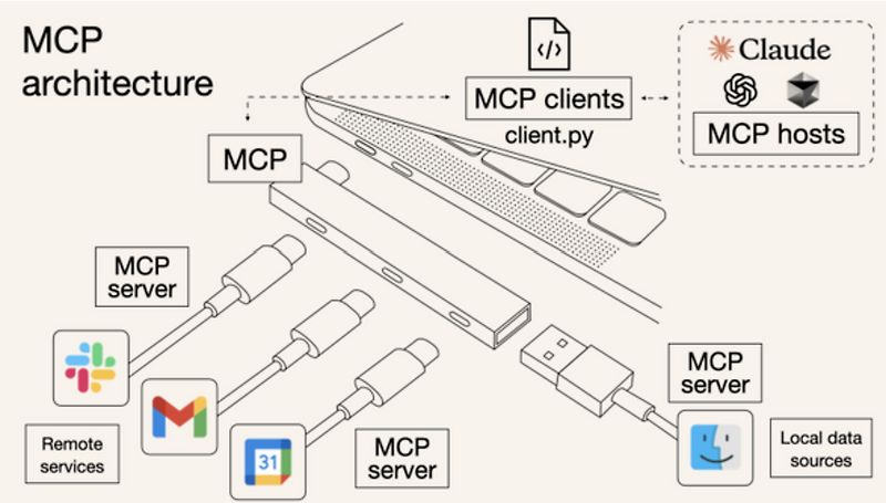 MCP는 대규모 언어 모델(LLM)과 외부 데이터 소스/도구를 연결하기 위한 오픈소스 표준 프로토콜로, 2024년 말 앤트로픽(Anthropic)이 발표했습니다. USB-C가 다양한 기기를 연결하는 것처럼, MCP는 AI 모델이 파일 시스템, 데이터베이스, 클라우드 서비스 등과 표준화된 방식으로 상호작용할 수 있도록 설계되었습니다.