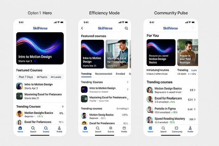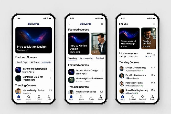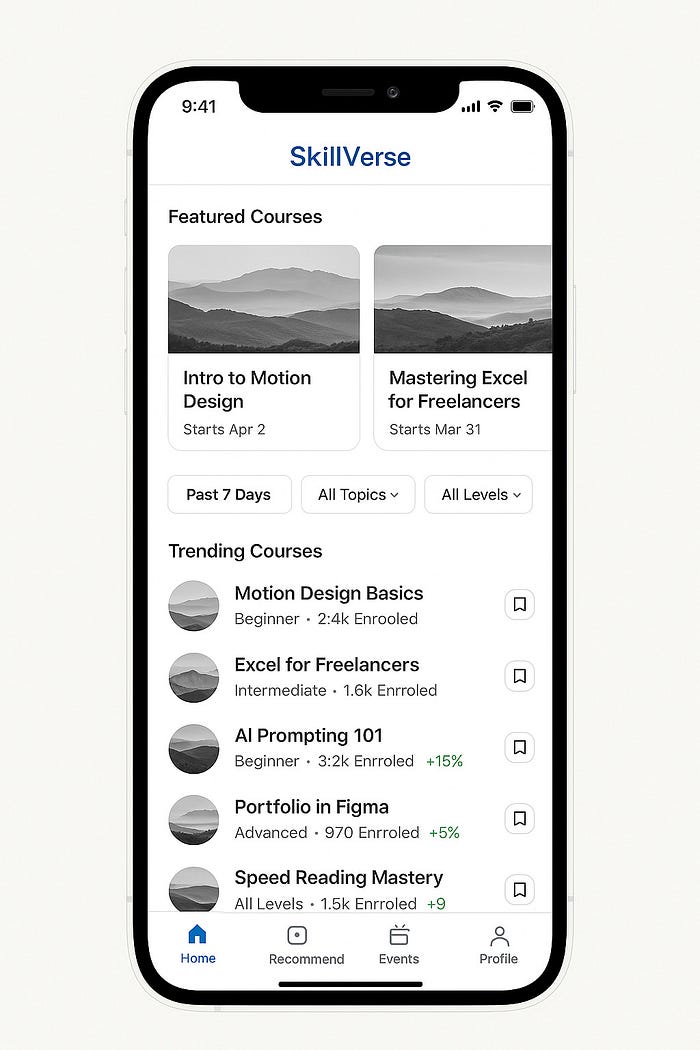 # "SkillVerse – Trending Micro-Courses"라는 앱의 깔끔하고 현대적인 모바일 UI 화면(iOS 스타일)을 디자인하세요. 레이아웃은 아래 구조화된 섹션을 따라야 합니다.