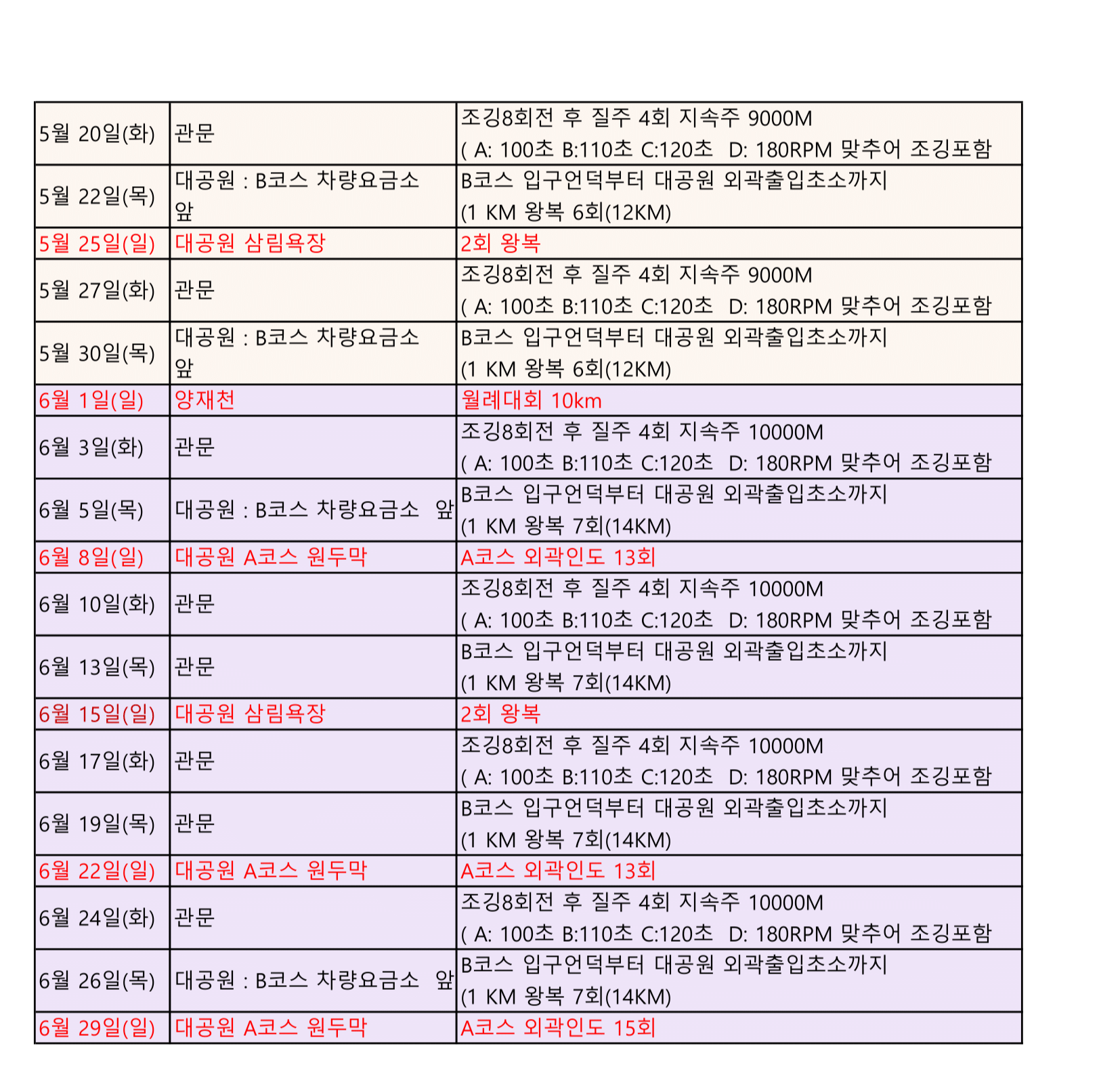 - 5월 29일 19:30 B코스 원두막 + 체조 후 F코스 조깅 후 원두막에서 초소까지 언덕훈련 10회전. 대공원 달리기 코스