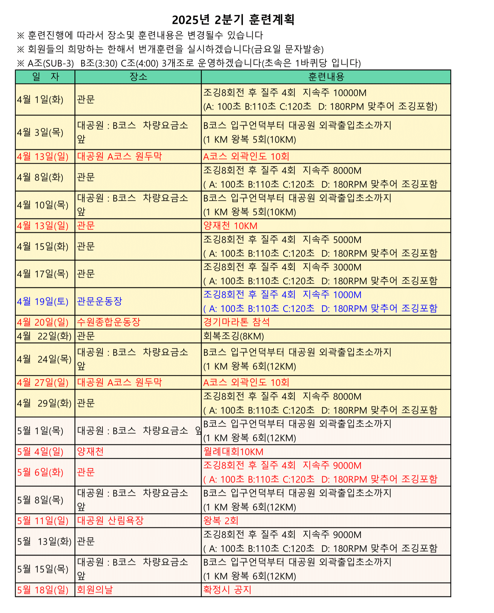 - 6월 1일 월례대회 06:30 관문집합 체조 후 양재천 10km, 더위로 인하여 하절기 6월부터 집합시간을 변경하였습니다. 참고하여 주시길 바랍니다.