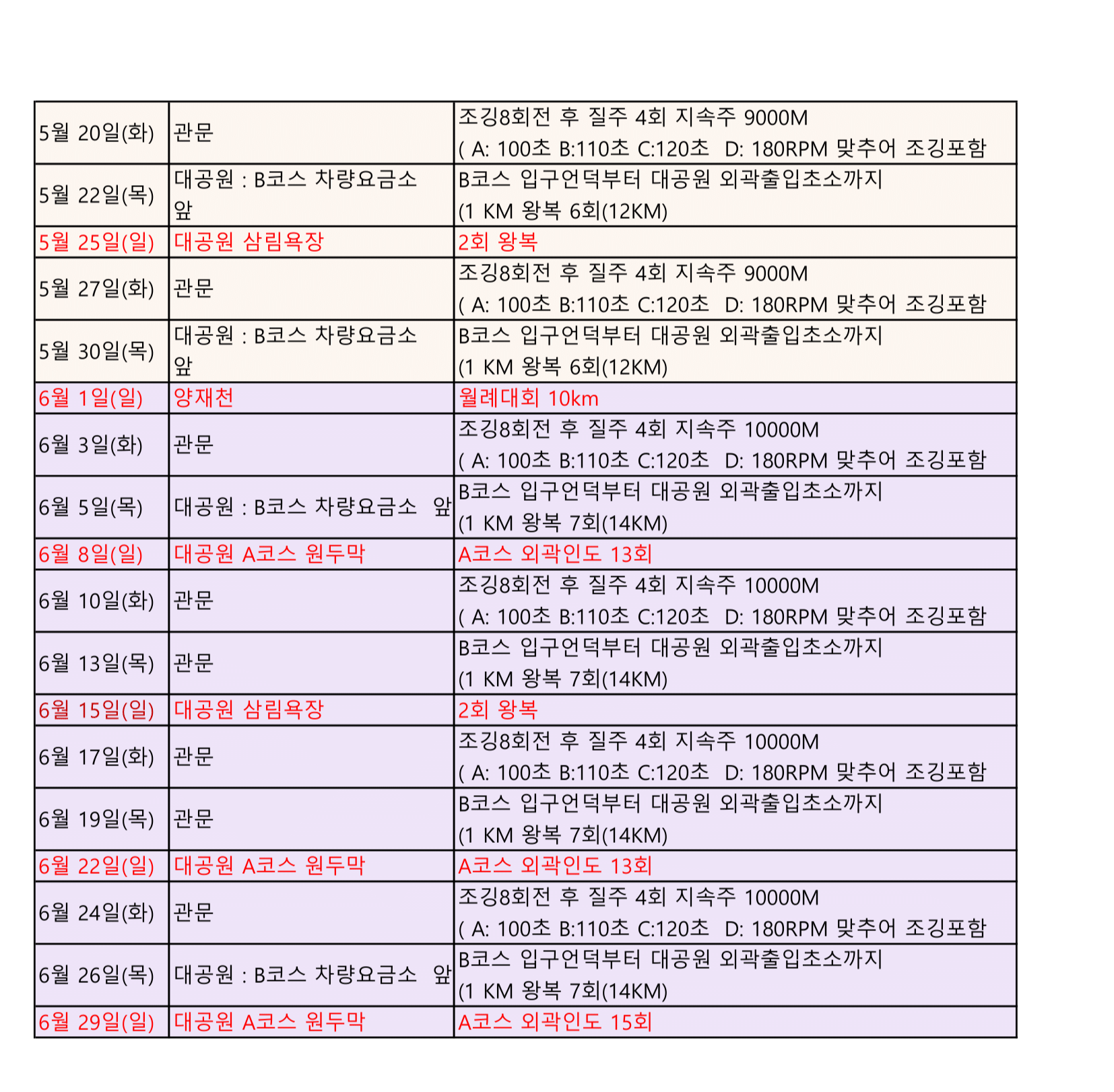 - 6월 10일 (화) 19:30 관문 조깅 8회전 질주 4회 400m 인터벌 10회 간주 100m 50초 휴식 대회페이스보다 조금 빠르게 자세에 신경 써서 완주목표로