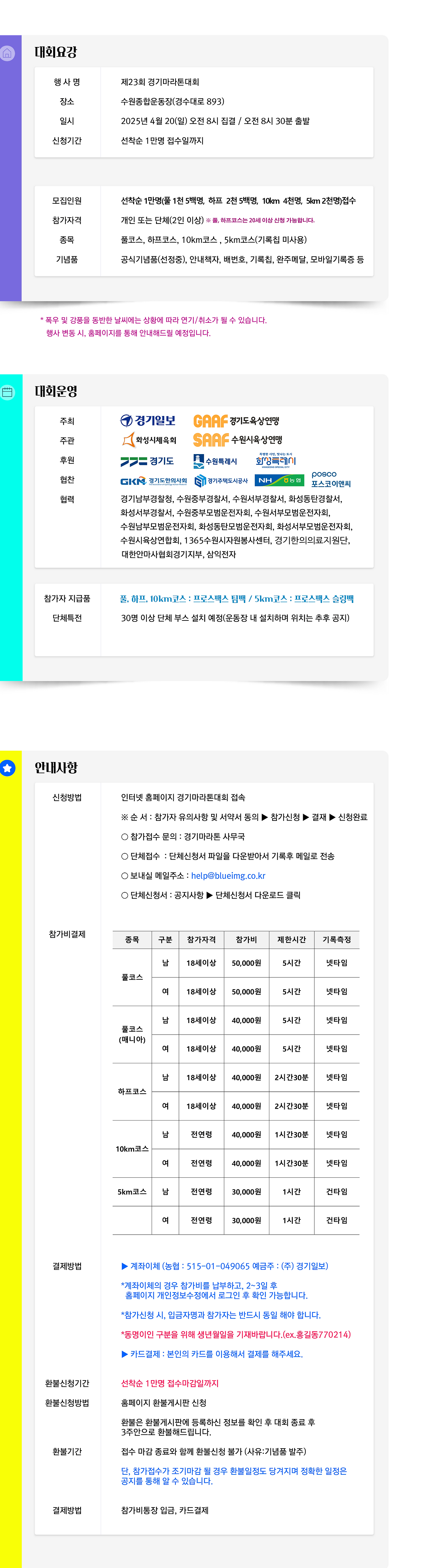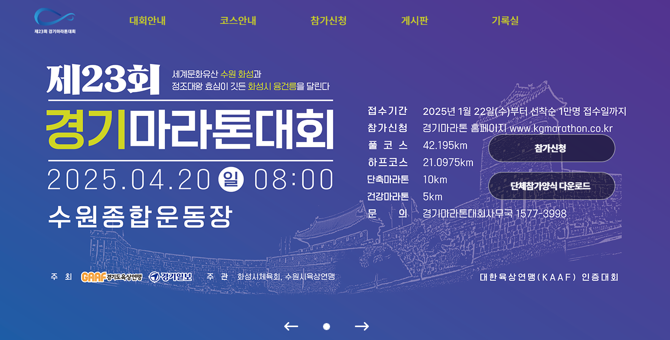 23회 경기 마라톤 대회가 4얼 20일 열린다. 출전한 적이 없는 대회지만 함께 운동하는 팀에서 출전한다고 해 찾아봤다. 집에서 가깝고 좋은 대회인데 3월에 서울 마라톤 대회에 참가하니 나갈 기회가 없었다. 내년에는 관심있게 보아야 겠다. 코스도 재미있어 보이고, 수원이니 가깝기도 하고.