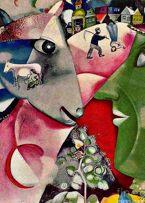 그의 작품 <나와 마을>에는 양과 사람이 마주보고 있고, 아래에는 꽃나무를 들은 손이 그려져 있습니다. 오른쪽에는 마을과 농부가 있구요. 이렇게 현실에서 양 머리 안에 다른 물체가 있는 것은 불가능하죠. 물리의 법칙을 위배합니다. 거꾸로 그려진 집과 여성도 마찬가지이구요. 중력의 법칙을 위배하죠. 이처럼, 샤갈의 작품은 현실 세계의 습관이나 시선으로 본다면 혼란스러울 수 밖에 없습니다. 따라서 이런 규칙들을 적용하려는 엄격한 자세를 버려야만 그림을 제대로 감상할 수 있죠.