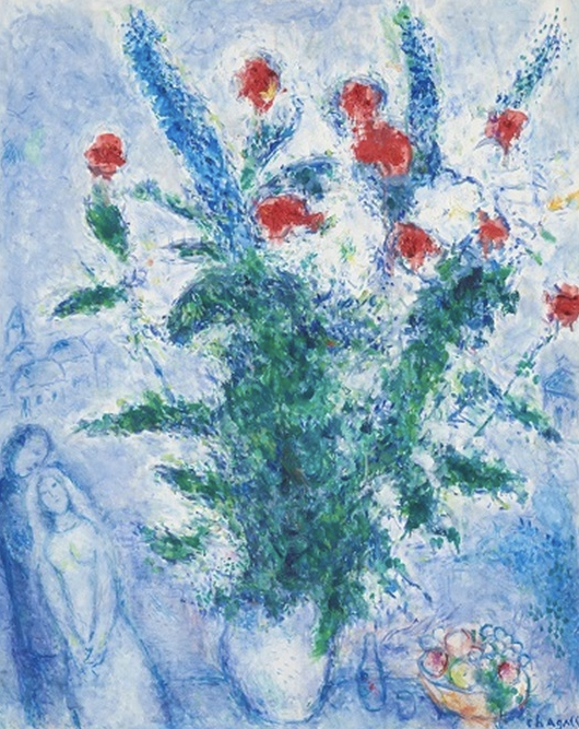 붉은 꽃다발과 연인들, 1975(왼쪽 아래 연인은 샤갈 본인과 벨라)