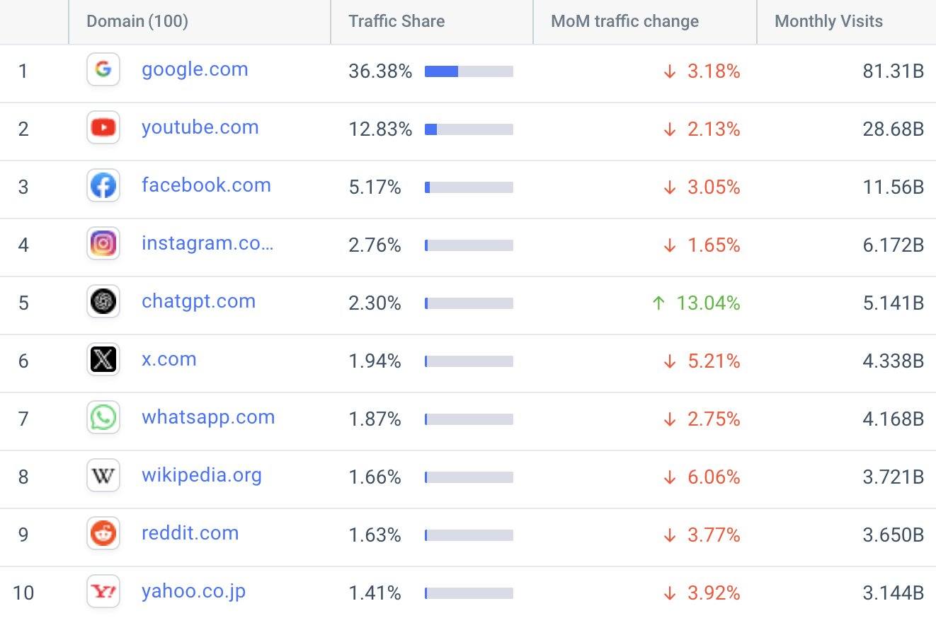 작년 ChatGPT는 전 세계에서 15번째로 많이 방문한 사이트였습니다. 이제 5위입니다.