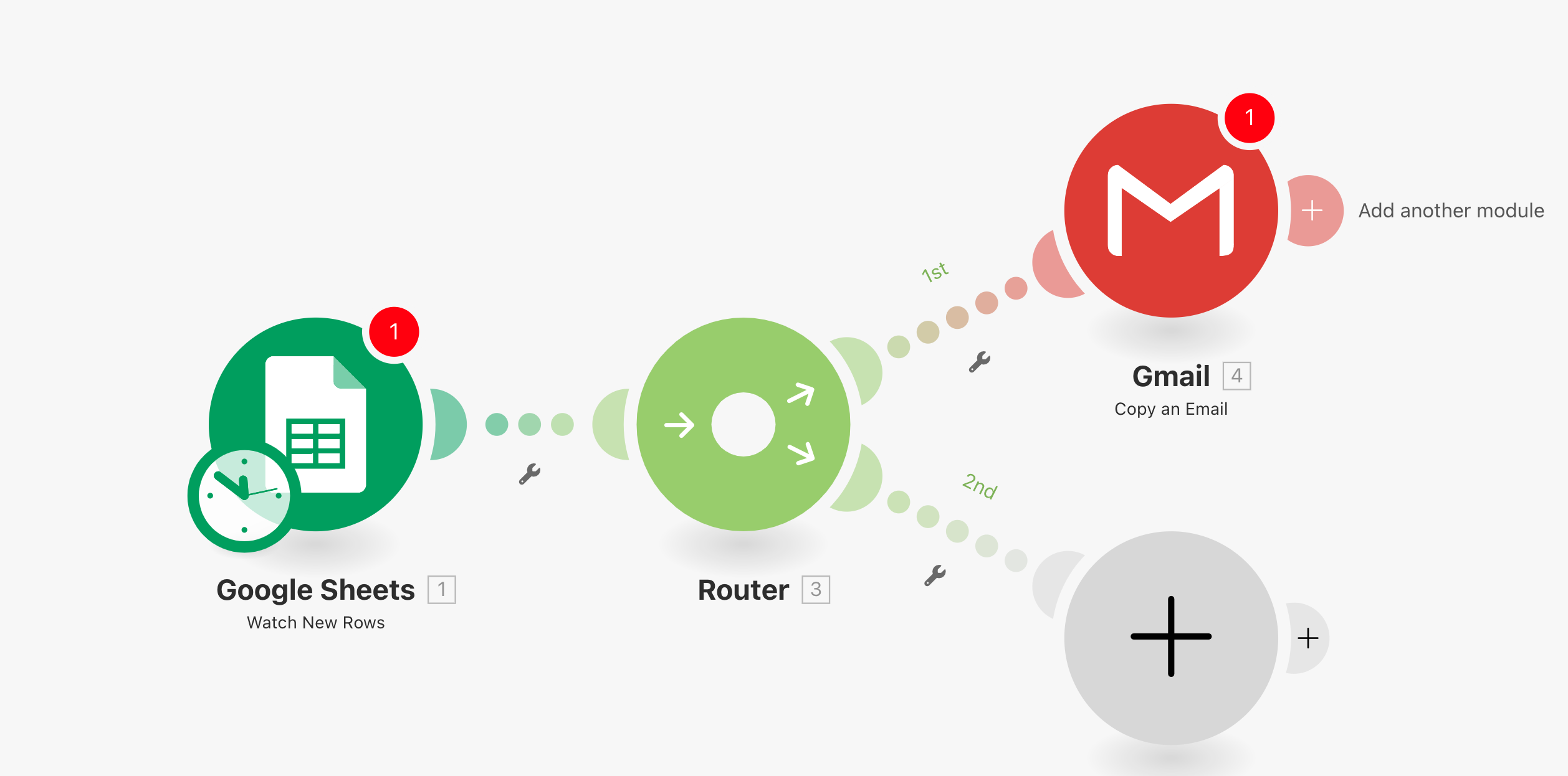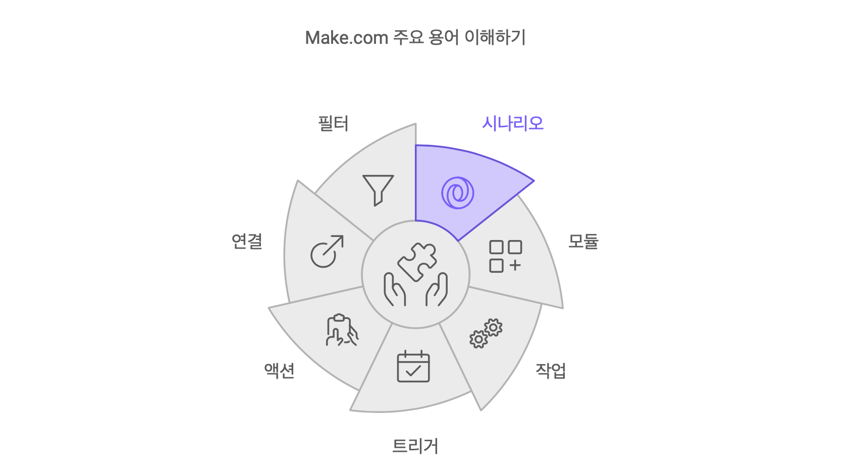 - 모듈(Module): 시나리오 내에서 사용되는 개별 앱, 트리거, 액션 등을 모듈이라고 합니다. 예를 들어 Google Sheets, Gmail 등이 모듈이 될 수 있습니다.
