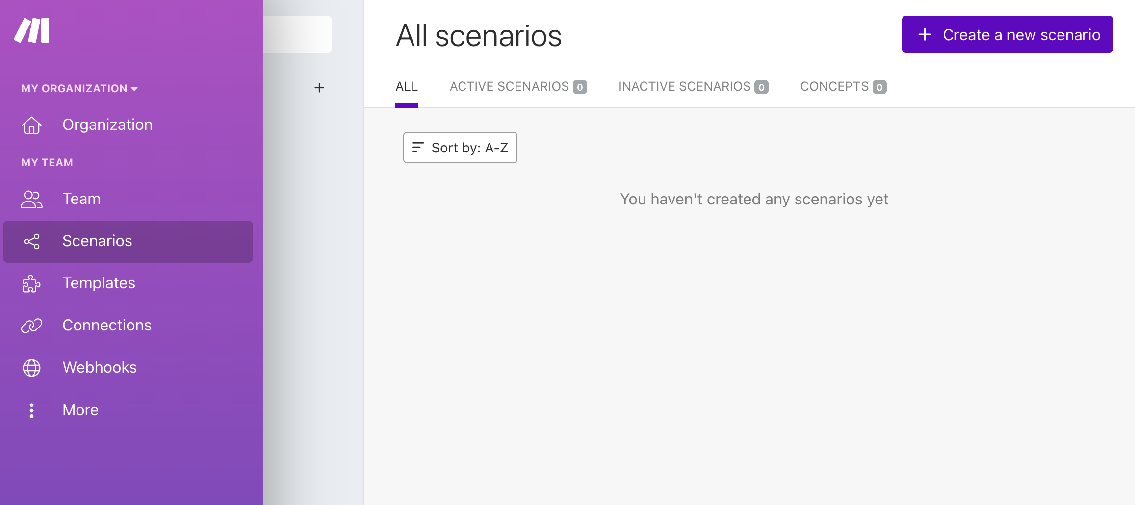 계정 생성 후 대시보드로 이동하게 됩니다. 여기서 새로운 시나리오를 만들 수 있습니다.