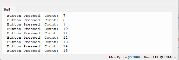 Raspberry Pi Pico 보드에서 이전 코드를 실행해 보세요. 푸시 버튼을 누를 때마다 Shell에 메시지가 표시됩니다.