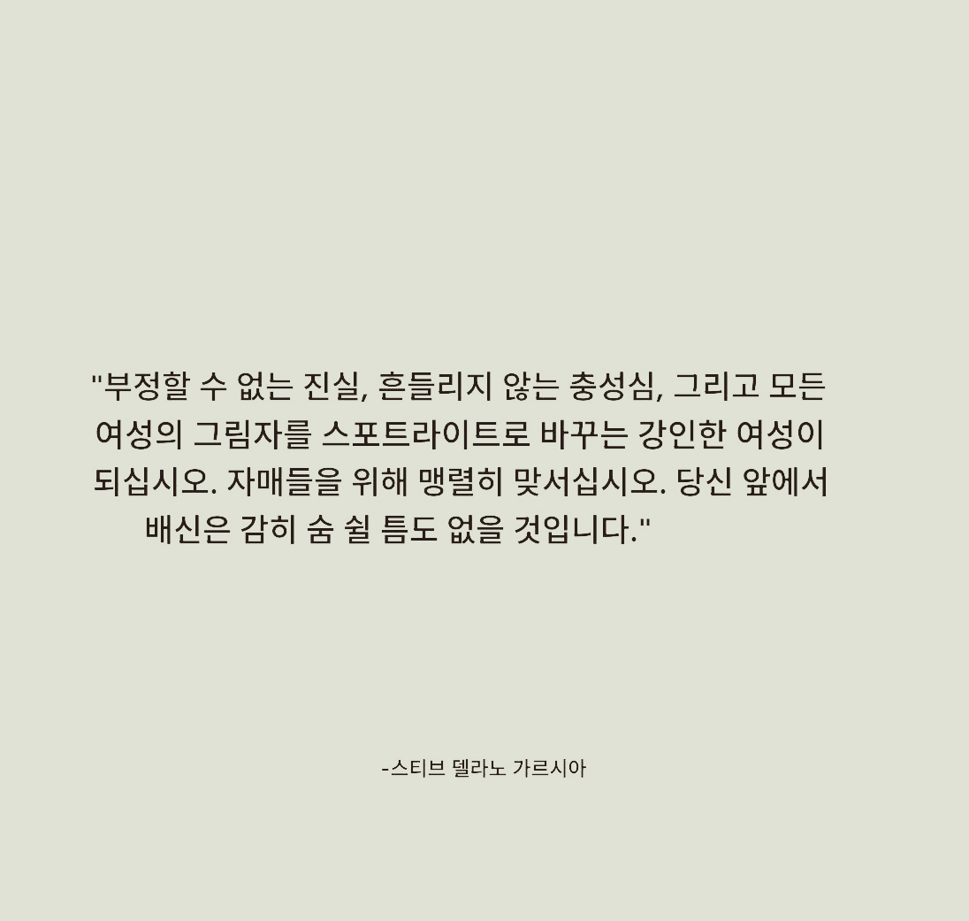 그리고 누군가 당신을 다른 여자와 경쟁하게 만들려고 할 때, 오, 여보, 굳건히 서세요. 누군가가 당신을 그들의 진부하고 저속한 드라마의 말단으로 내던지게 두지 마세요. 당신은 온통 체스판입니다. 그들이 판을 흔들려고 하는 시도를 비웃으세요. 당신은 제국을 만들어내느라 너무 바쁩니다. 당당하게 서서, 똑바로 말하고, 그들의 슬픈 서커스에서 감히 당신을 편들게 하는 사람에게서 뽐내며 물러나세요.