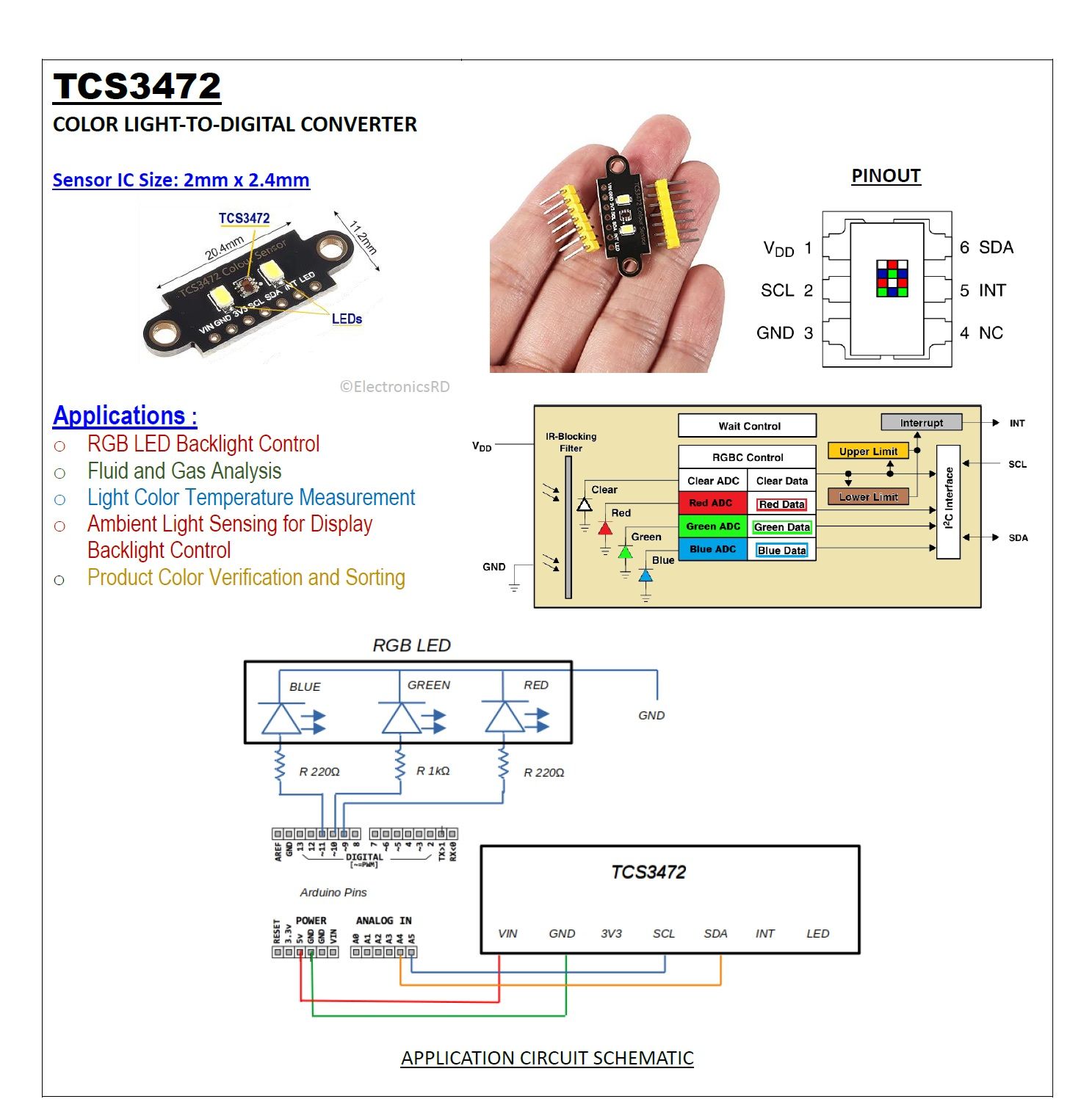 이 센서는 I²C를 통해 통신하며, 각 색상 채널에 IR 차단 필터와 ADC를 내장하고 있습니다. 이 센서는 소형(2mm x 2.4mm)이며, RGB LED 백라이트 제어, 디스플레이용 주변 광도 감지, 광 색온도 측정, 제품 색상 검증 등 다양한 응용 분야에서 널리 사용됩니다.