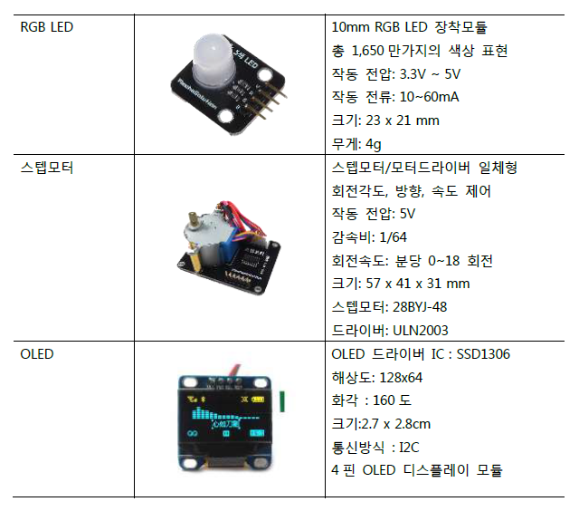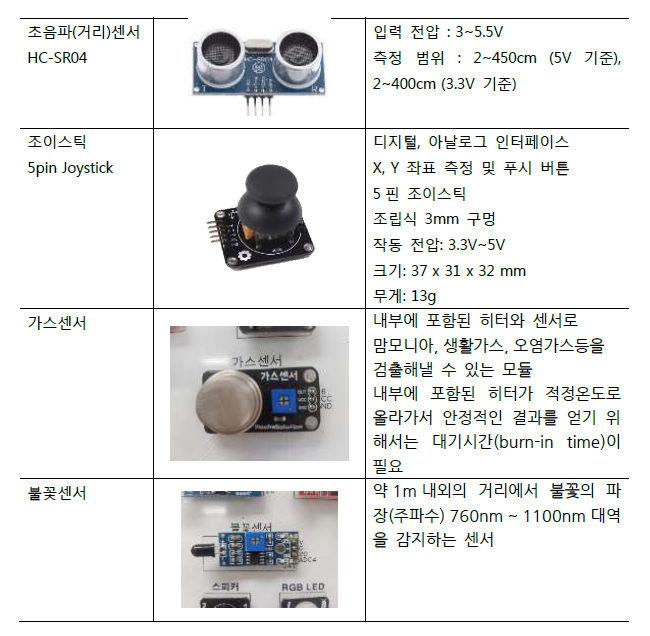 | API | GPIO 제어 - 가스, 인체감지, 온/습도, 근접, 초음파, 음향, 불꽃, 조도센서 드라이버, - DC 모터, 서보모터, 팬, RGB LED, LED, 부저 액츄에이터 드라이버, |