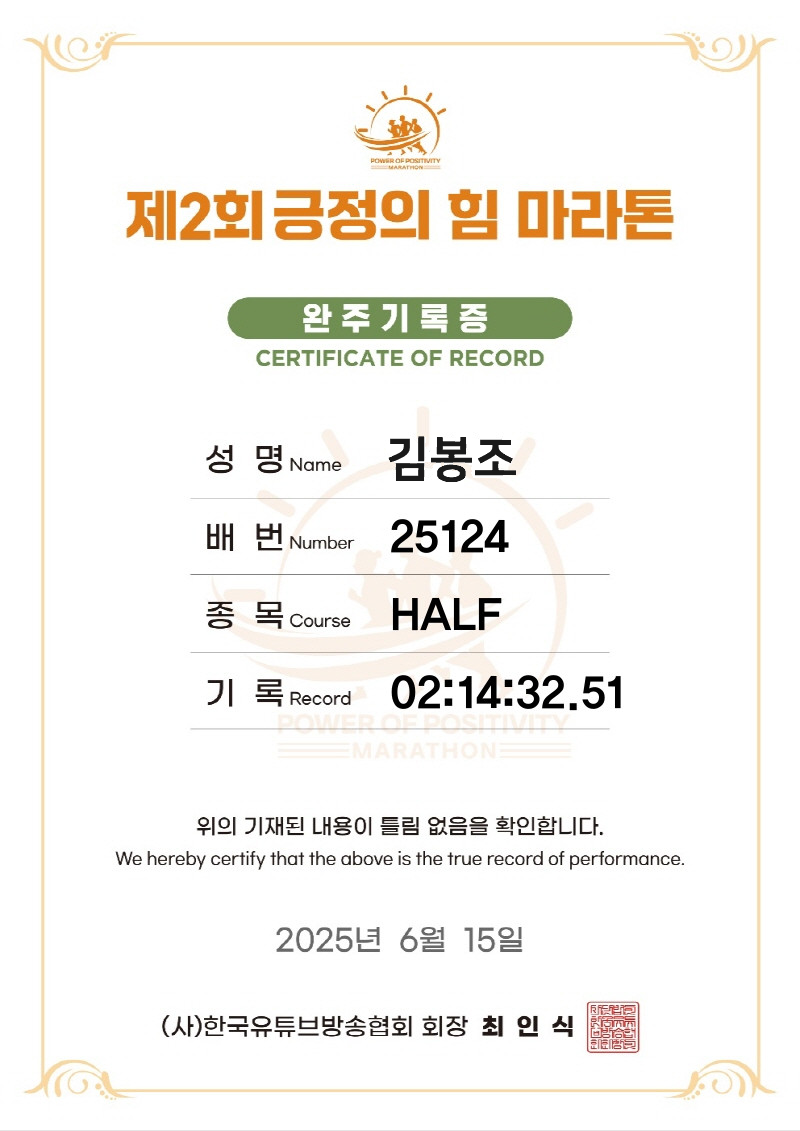 | 긍정의 힘 마라톤 대회, 주로는 늘 건조하고 메말랐다. (1) | 2025.06.14 |