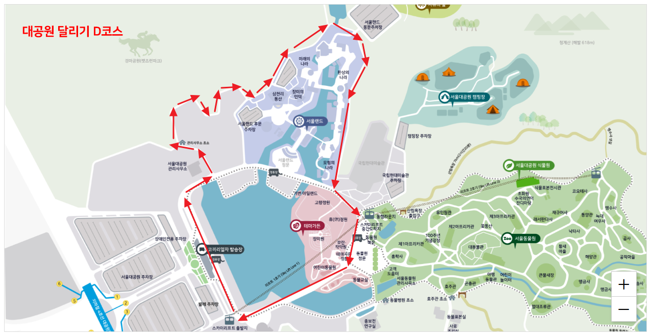 D코스 : 대공원파출소코스, 3.76 km 리프트 매표소 - 코끼리열차 호수길 - 리프트 내리는 곳 - 서울랜드 후문 - 약수터 - 검문소 - 대공원 파출소 - 코끼리열차 호수길 코스입니다. 왕복 차량이 많아지는 8시 이후 차량에 주의