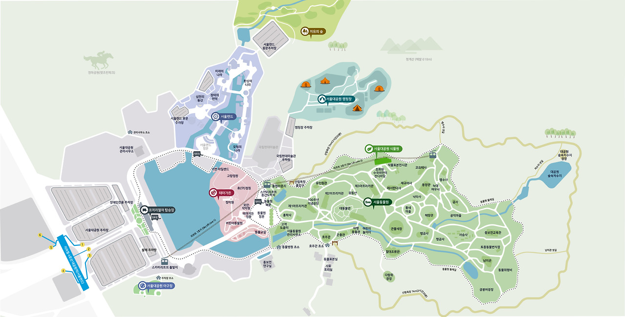 아래 전체 지도를 참고로 6개인 A코스부터 F코스까지 다시 그렸다. 예전 자료는 이곳을 참고한다. 모든 지도는 누군가 새로 만들기도 하고 없어지기도 한다. 보물지도가 아니라서 비밀이 아니다. 러너라면 꼭 한 번은 대공원을 달려보기 바란다. 자기가 사는 집이 가장 아름답고 편안한 곳이다. 러너가 자주 달리는 길이 가장 편하고 보기에도 아름다운 주로다. 그럼에도 대공원 코스를 달리면 그 매력에 푹 빠질 것이다. 가장 멋진 주로의 한 곳으로 생각할 게 틀림없다.