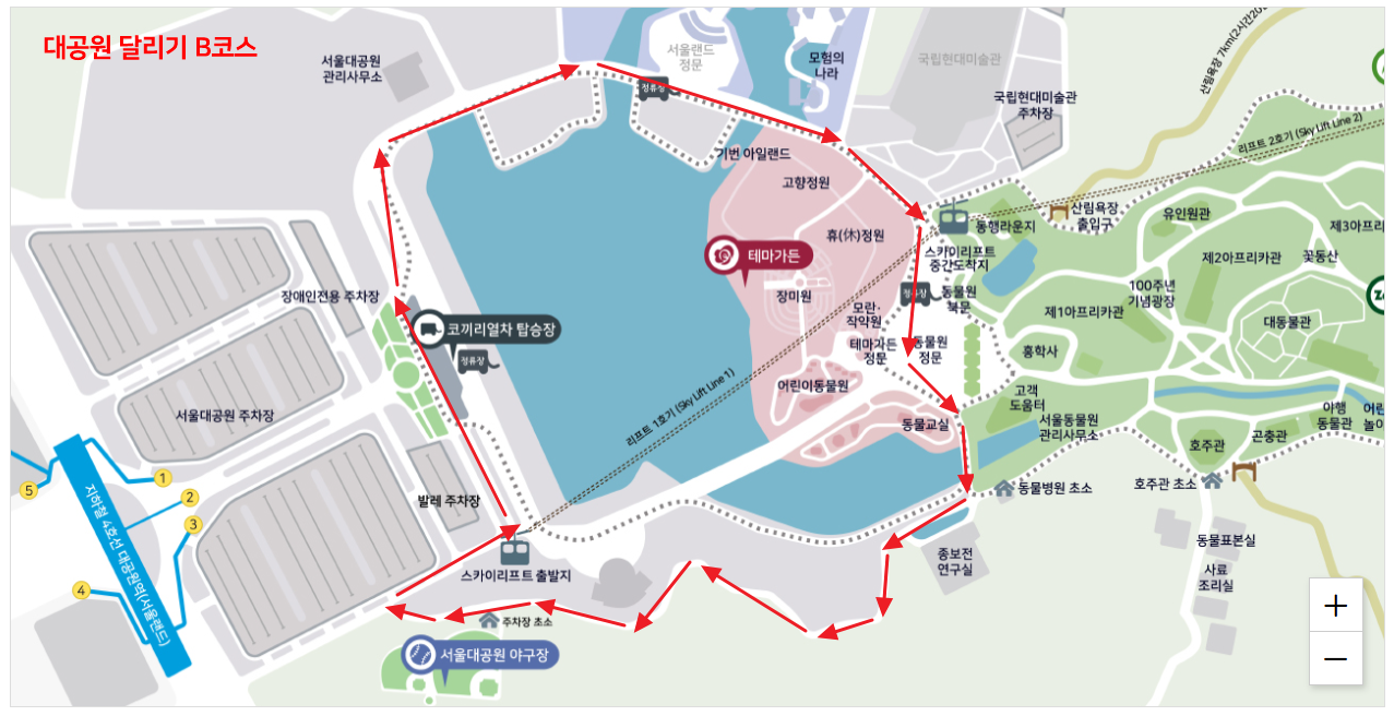 B코스 : 복돌이동산코스, 3.01 km 리프트 매표소 - 복돌이동산 앞 - 동물원 앞 - 코끼리열차 다니는 길 코스로 복돌이동산 앞에서 약 1km 정도의 오르막 길이 나오며 언덕훈련하기 적합한 코스입니다.