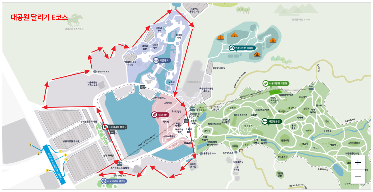 E코스 : 외곽코스, 5.33 km 리프트 매표소 - 조각 분수대 - 미술관 가는 길 - 서울랜드 후문 - 리프트 내리는 곳 - 동물원 - 동물병원 - 복돌이동산 - 리프트 매표소 코스로서 오르막 길이 심하여 상급자 코스입니다. 아침 일찍 달려야 한다. 차량이 많아지는 8시 이후 차량에 주의
