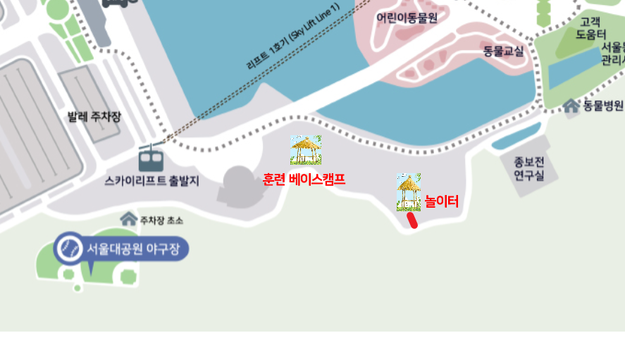 아래 지도에 언덕 훈련 베이스캠프와 대공원 훈련을 마치고 노는 아지트가 표시되어 있다.