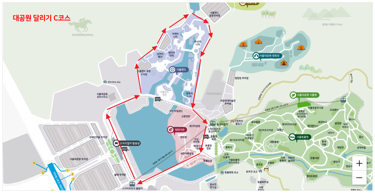 C코스 : 서울랜드코스, 3.41 km 리프트 매표소 - 코끼리열차 호수길 - 리프트 내리는 곳 - 서울랜드 후문 - 약수터 - 검문소 - 코끼리열차 호수길 코스로 완만한 언덕이 있습니다.