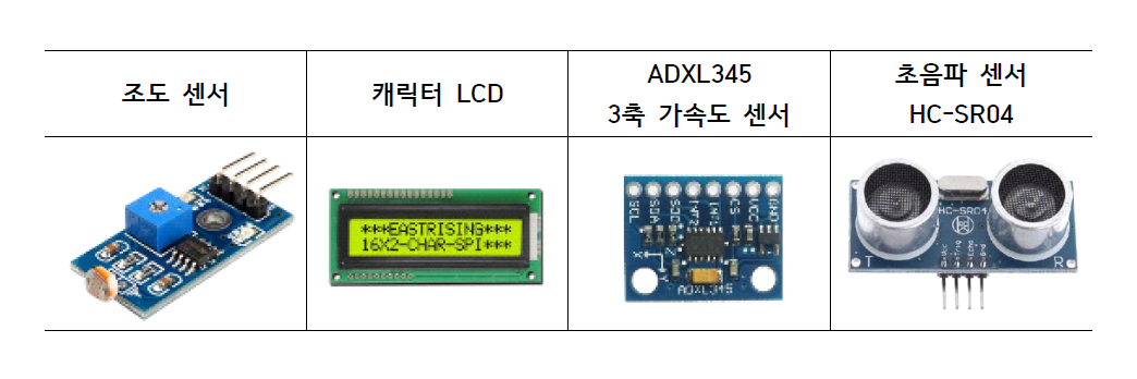 2.4. 기본 실습 센서 4종 GPIO 입출력에 사용하는 가장 기본적인 구성품입니다. 이러한 부품을 이용해 GPIO 제어방법 과 통신 방식에 대해 학습이 가능합니다. 실습 센서와 액추에이터는 조도센서, 캐릭터 LCD, 3축 가속도 센서, 초음파 센서를 제공합니다.