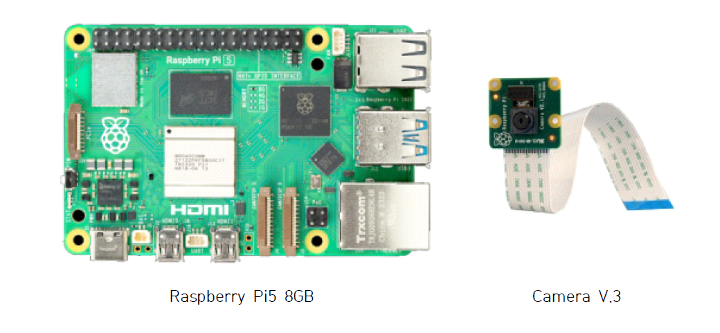 라즈베리파이 5 최근 버전을 사용하며, 라즈베리파이 전용 카메라 모듈이 라즈베리파이 보드 상단에 조립되어 있습니다. 라즈베리파이 메인 보드와 카메라 모듈을 탑재하여 시스템의 핵심 기능을 수행하며, 파이선 코딩 및 GPIO 제어를 위한 기반 환경을 제공합니다.