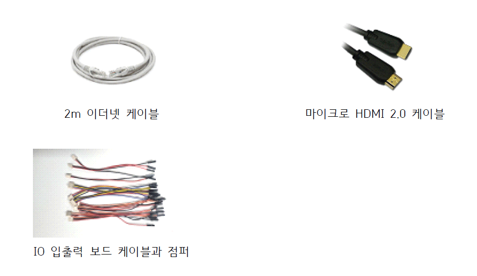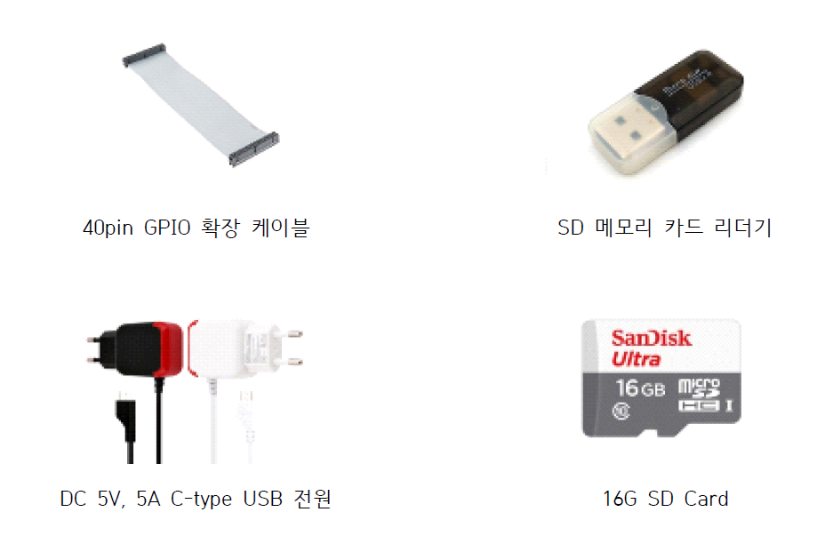 제품에는 라즈베리파이에 필요한 어댑터와 케이블, GPIO 입출력 보드 연결 케이블, 실습용 점 퍼 와이어 등 쉬운 실습 과정에 필요한 모든 케이블이 포함되어 있습니다.