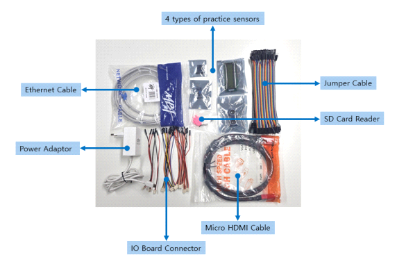 액세서리는 라즈베리파이 실습에 필요한 모든 주변 장비와 실습 센서 4개(LCD, 조도 센서, 3축 가속도 센서, 초음파 센서), 연결 점퍼, GPIO 입출력 보드에 사용하는 케이블로 구성되어 있습니다.