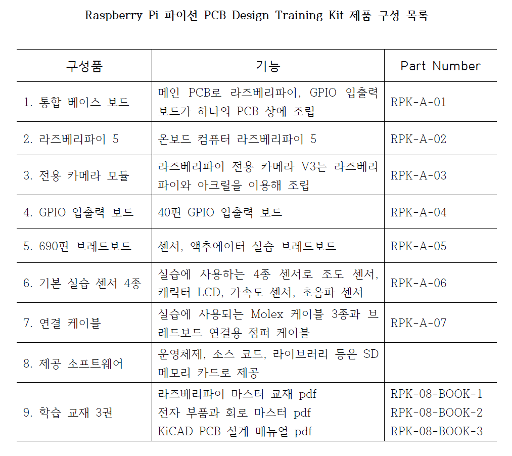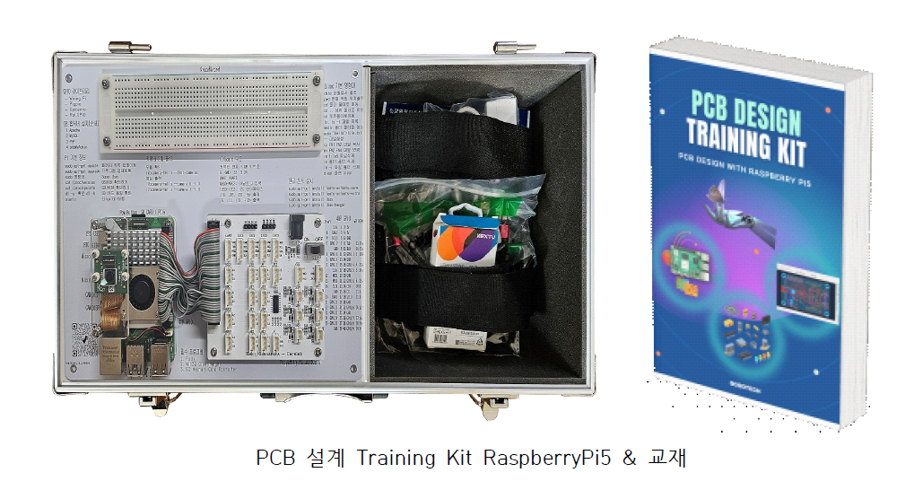 라즈베리파이 기반의 리눅스 환경에서 파이선 코딩 학습을 시작으로, 전자 부품과 전자 회로에 대한 이해를 넓히고, 나아가 KiCAD EDA(전자 설계 자동화) 프로그램을 사용하여 직접 PCB를 설계하고 제작 또는 제품 개발 과정을 경험할 수 있도록 구성된 종합 학습 장비입니다.
