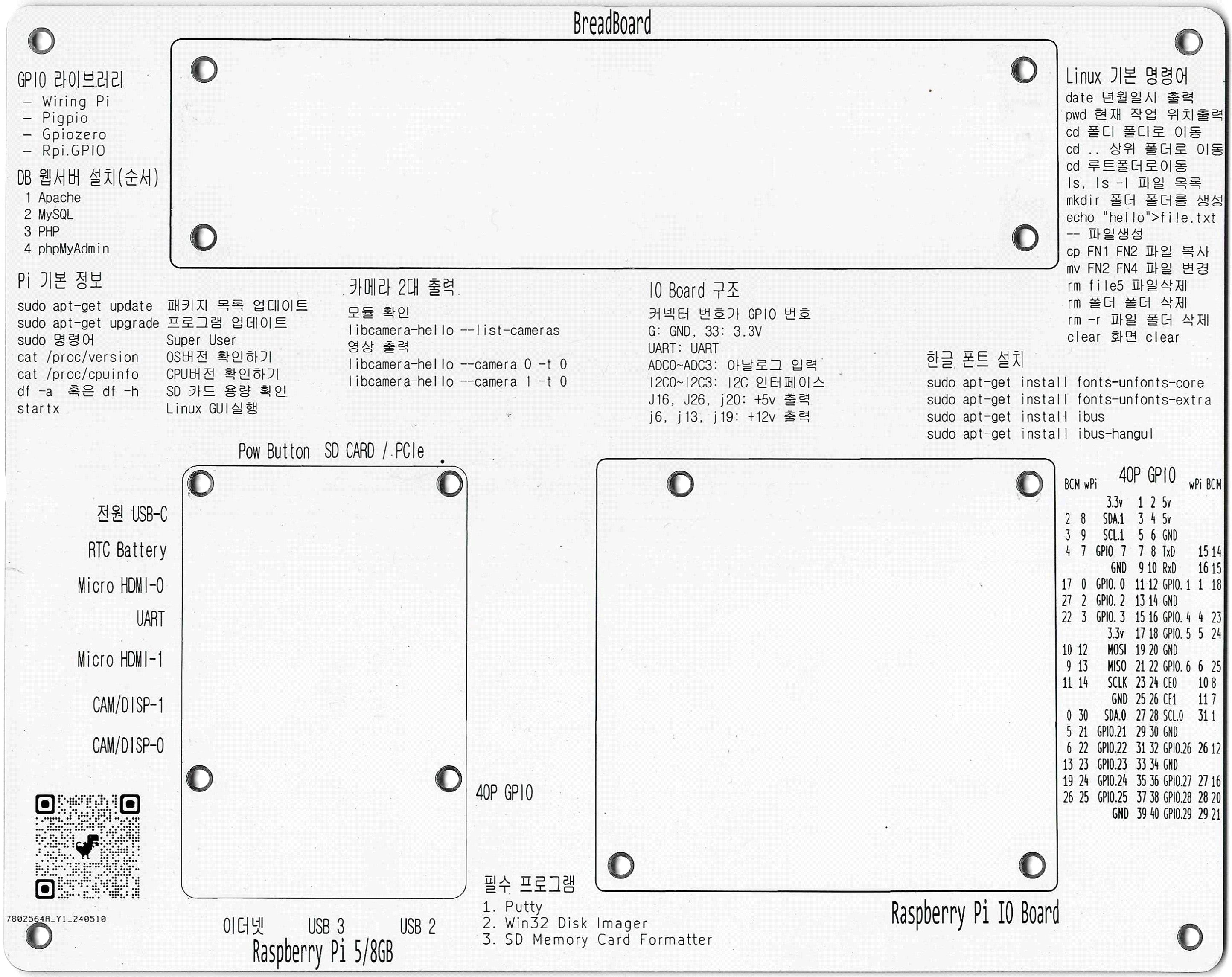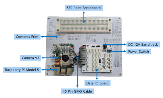 라즈베리파이 보드와 카메라 모듈이 PCB 기판 위에 통합되어 있으며, 690핀 브레드보드와 GPIO 입출력 포트를 쉽게 사용할 수 있도록 IO 보드가 포함되어 다양한 실습 환경을 제공합니다.